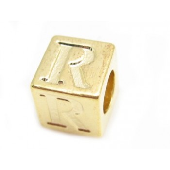 Guld belagt “R” bogstav perle, på 8 x 8 mm med 4,5 mm hul. Brug den i et knyttet armbånd til led, eller i en halskæde til led.
