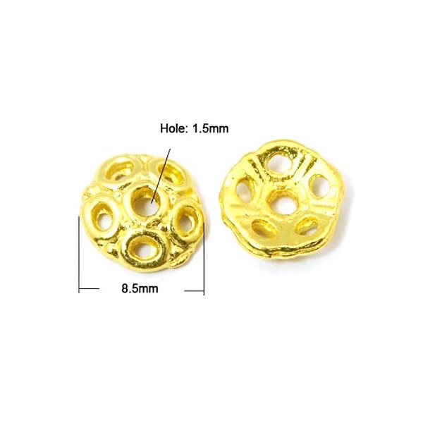 Perleskål på 8,5 mm med 2 mm hul i metal, du får 14 stk. Perleskåle har mange anvendelses muligheder.
